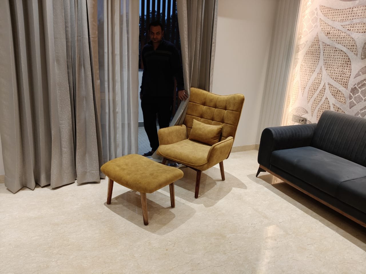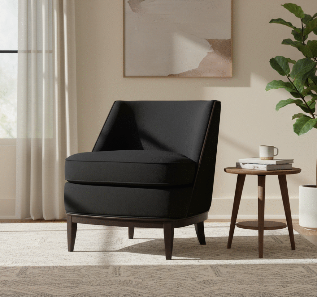 The chair is very comfortable and stylish. Perfect for relaxing after long days. Fabric and frame quality are impressive. Adds elegance to our living room.
