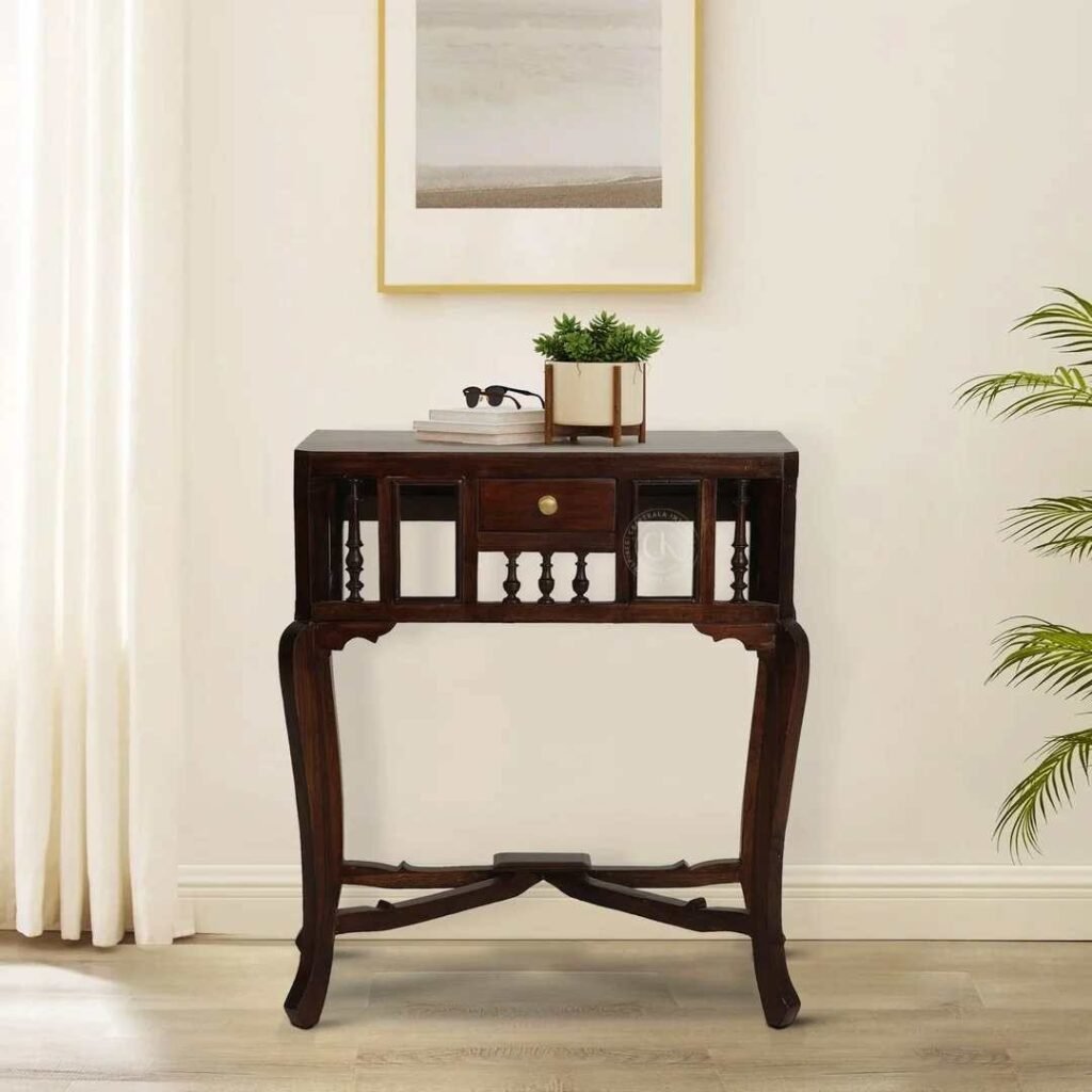 Console tables are typically placed against walls or behind sofas. A wooden console table adds elegance while providing space for decorative items such as lamps, plants, and photo frames.