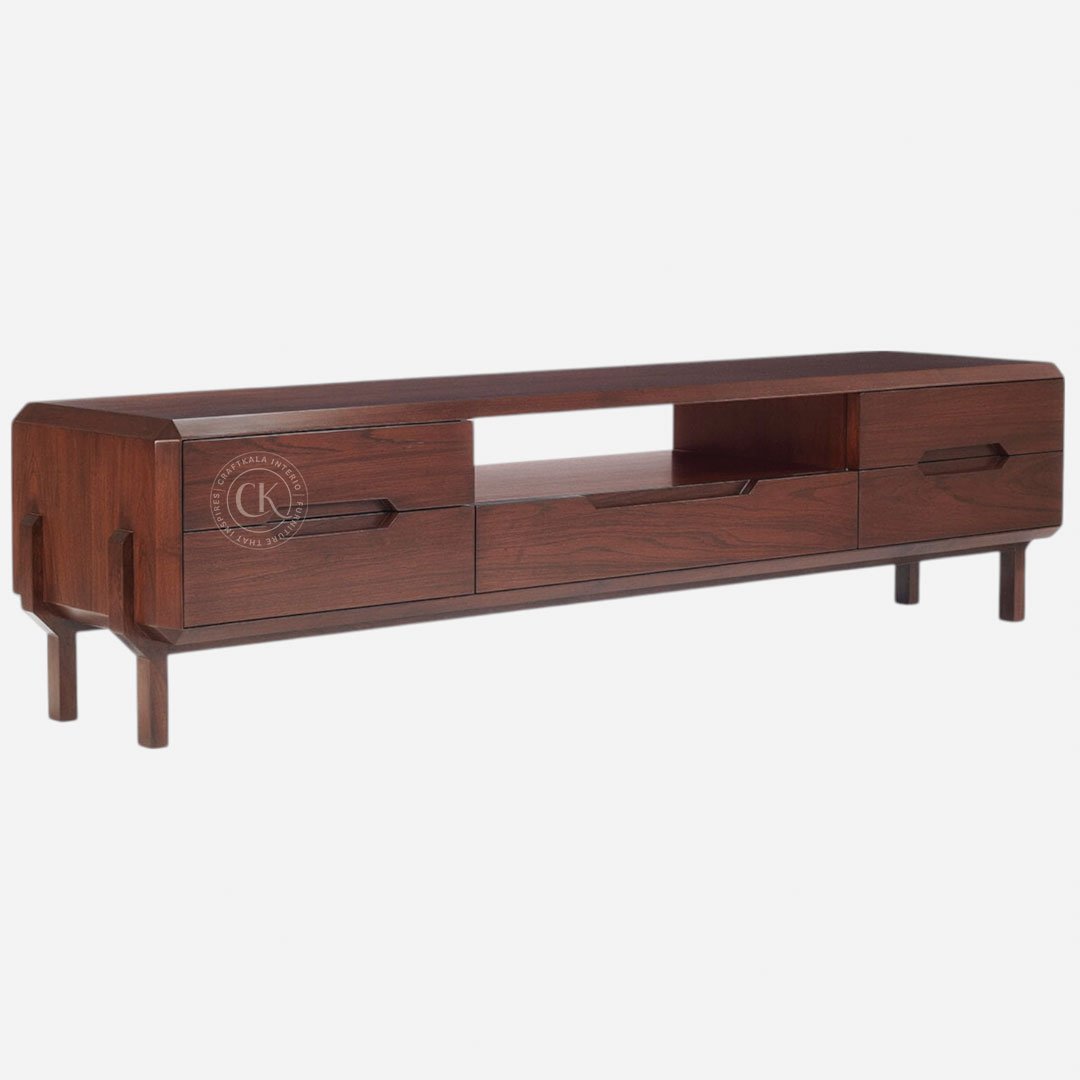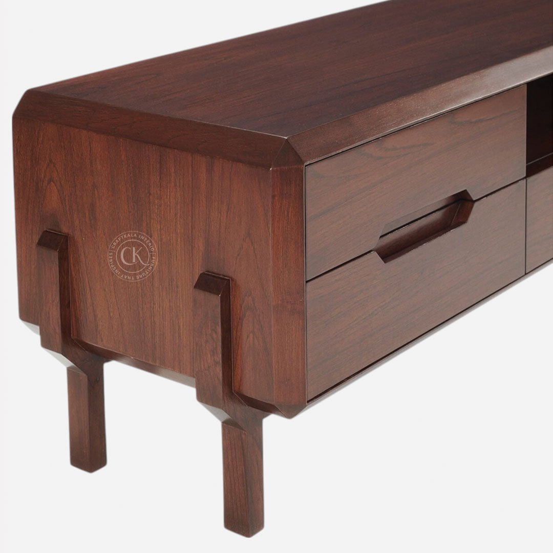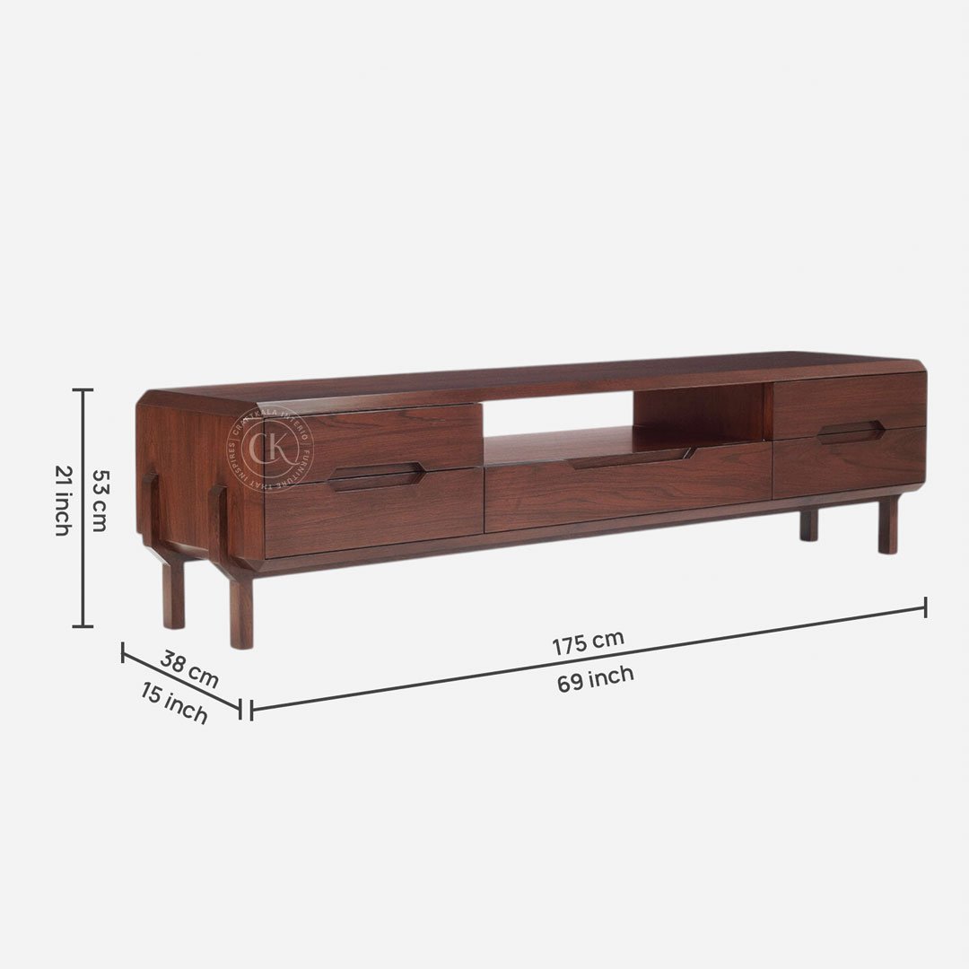 Made With Teak Wood and Teak Veneer Supports TVs Up To 75 Inches Five spacious drawers for concealed storage Open shelves for media devices and décor Elevated legs for easy cleaning and light visual appeal