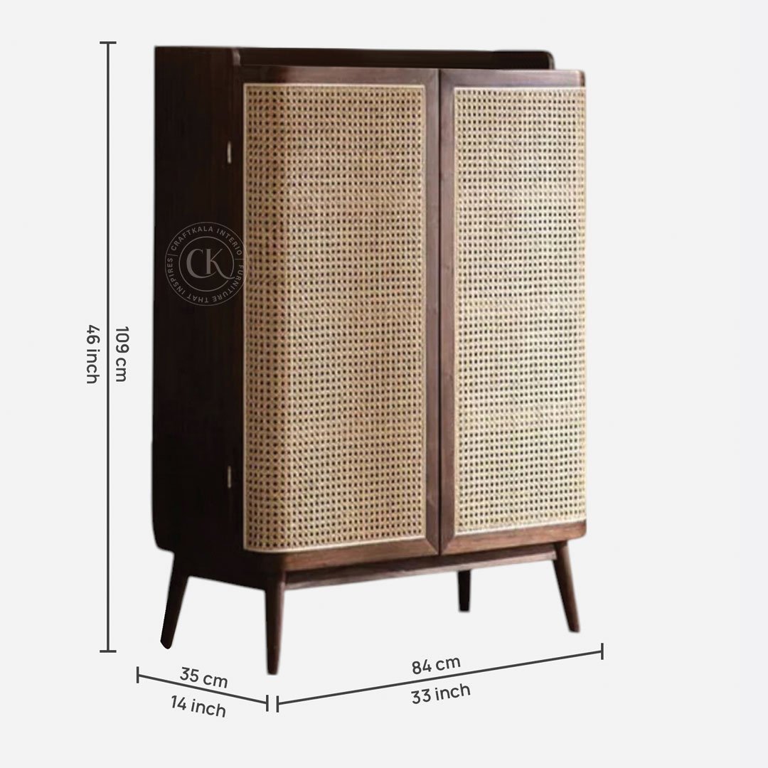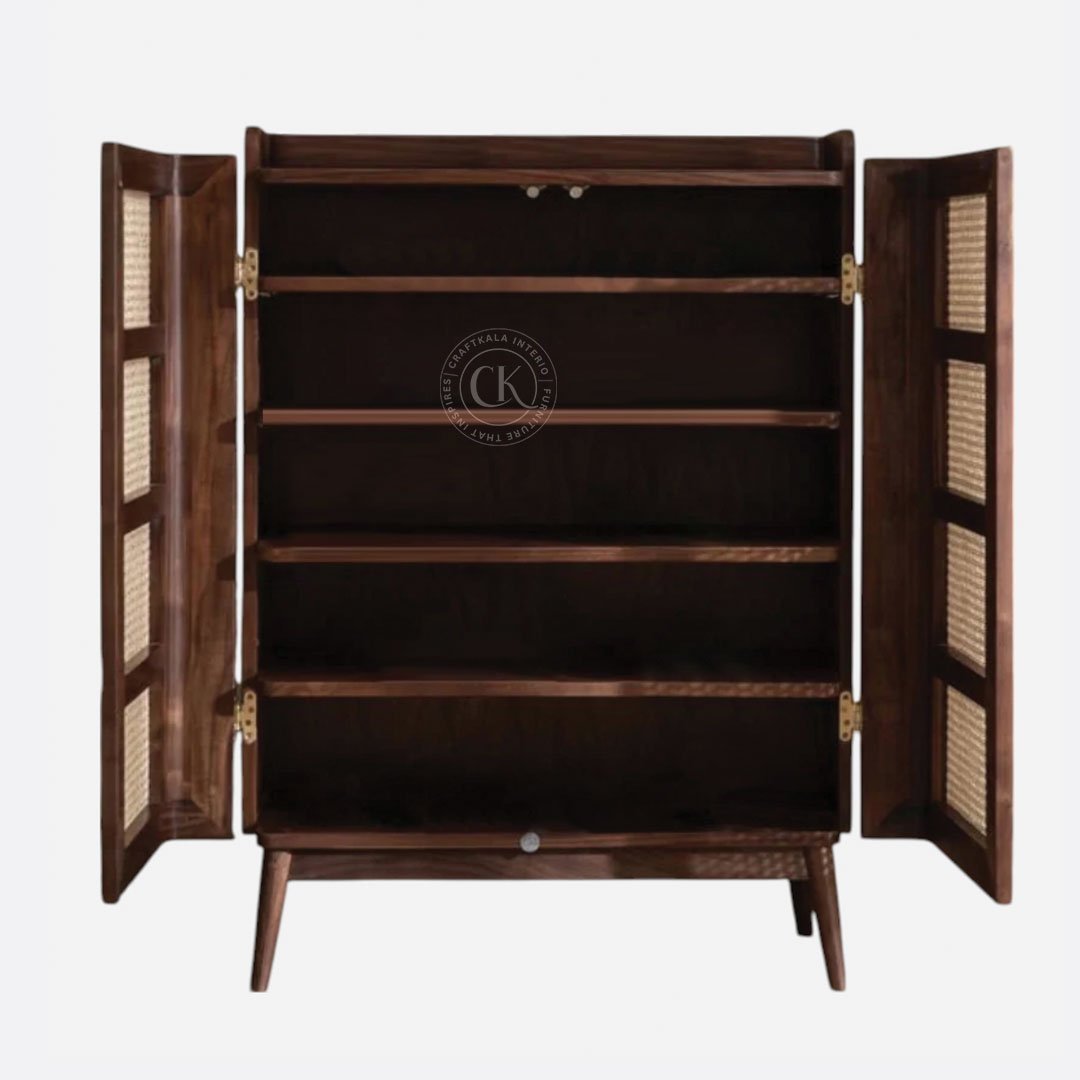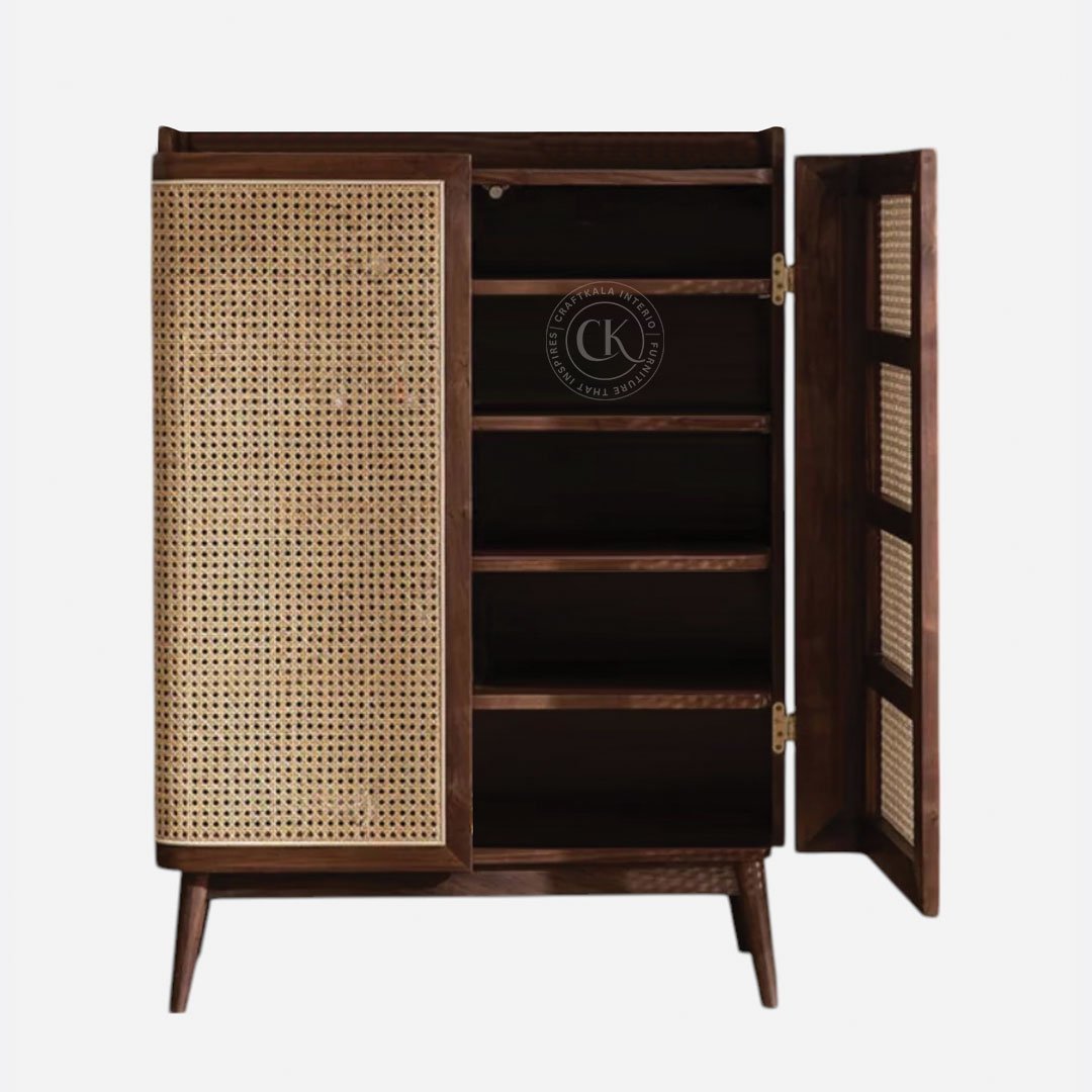 Made With Solid Sheesham Wood Handwoven Natural Rattan Mesh On Doors Two-Door Shoe Rack With Rounded Outer Door Edges For Soft, Organic Appeal 5 Internal Shelves For Organized Shoe Storage Tapered Solid Wood Legs For Added Height And Visual Lightness Functional Flat Top To Hold Décor Or Everyday Essentials Rattan Mesh Allows Natural Airflow To Keep Footwear Fresh Ideal For Entryways, Bedrooms, And Foyers With A Modern Indian Touch