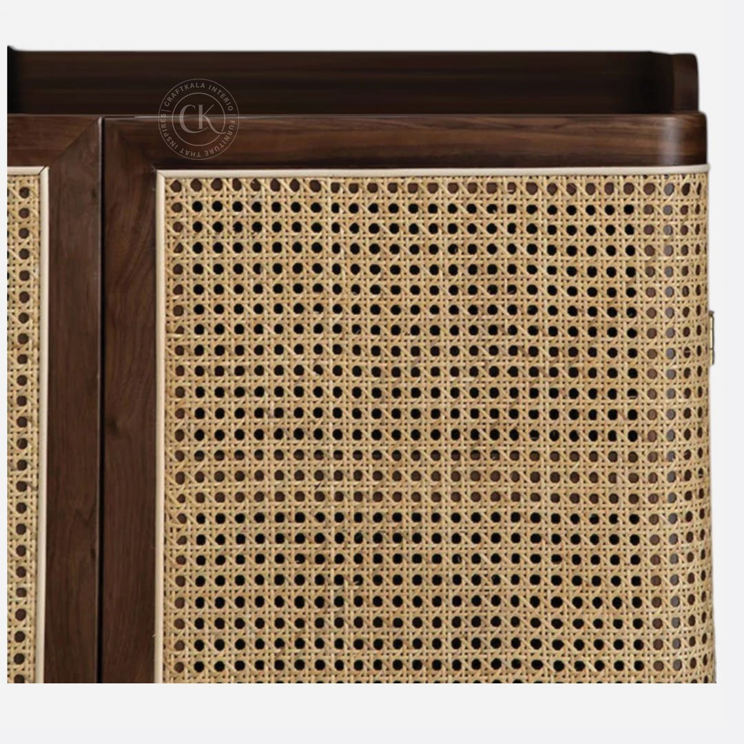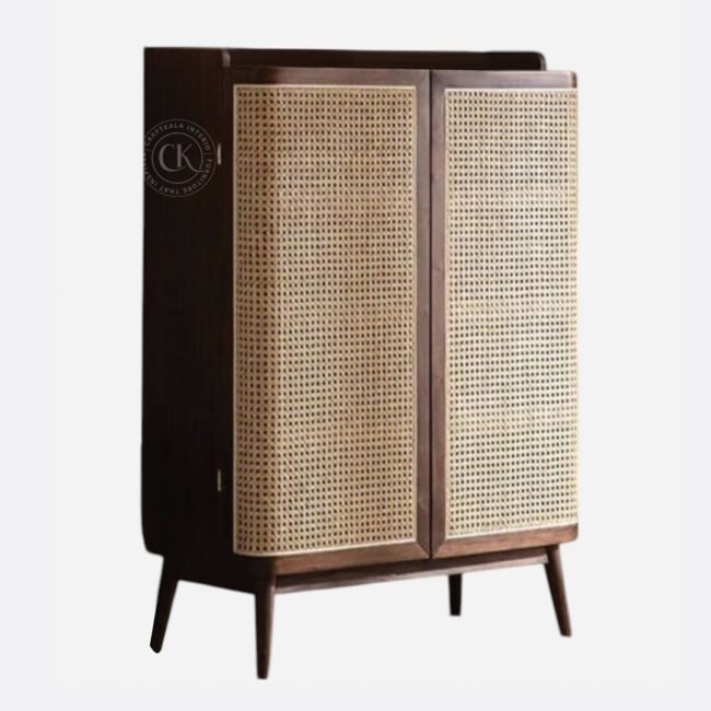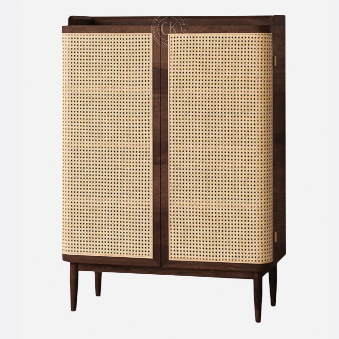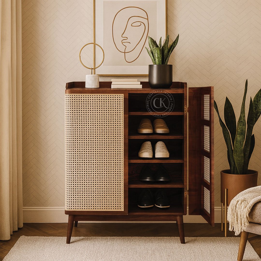 Made With Solid Sheesham Wood Handwoven Natural Rattan Mesh On Doors Two-Door Shoe Rack With Rounded Outer Door Edges For Soft, Organic Appeal 5 Internal Shelves For Organized Shoe Storage Tapered Solid Wood Legs For Added Height And Visual Lightness Functional Flat Top To Hold Décor Or Everyday Essentials Rattan Mesh Allows Natural Airflow To Keep Footwear Fresh Ideal For Entryways, Bedrooms, And Foyers With A Modern Indian Touch